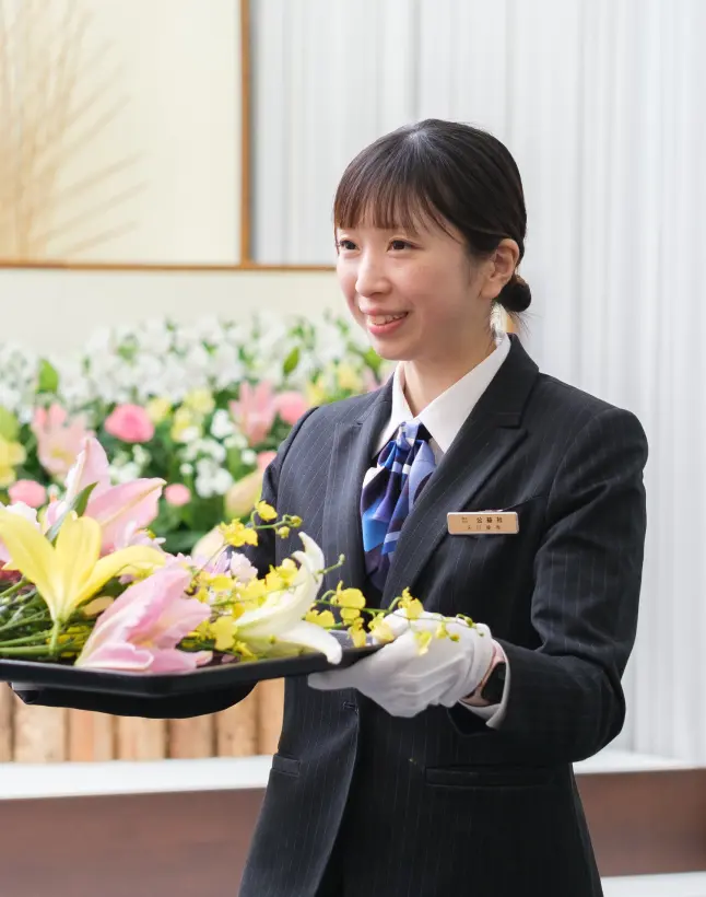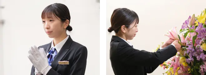 ご遺族や参列者のご案内や進行のサポートなど、滞りなくセレモニーが行えるよう支える仕事です。スタッフが連携し、その場にふさわしい空間を整えていきます。